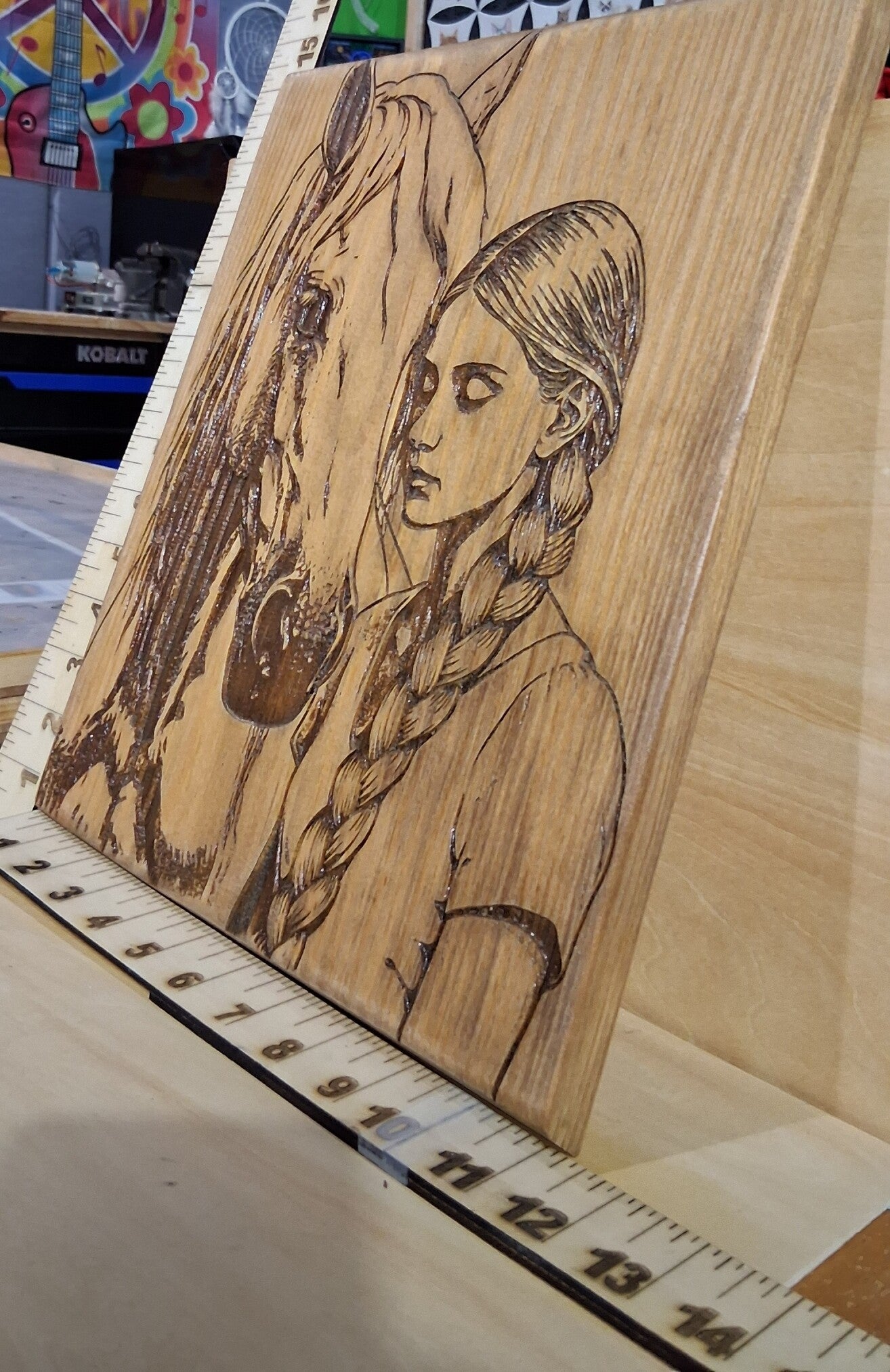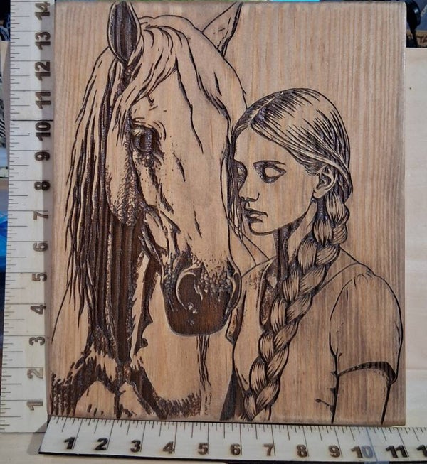 Girl and Her Horse - Deep Engraving on Whitewood with a light stain. 14"x11"