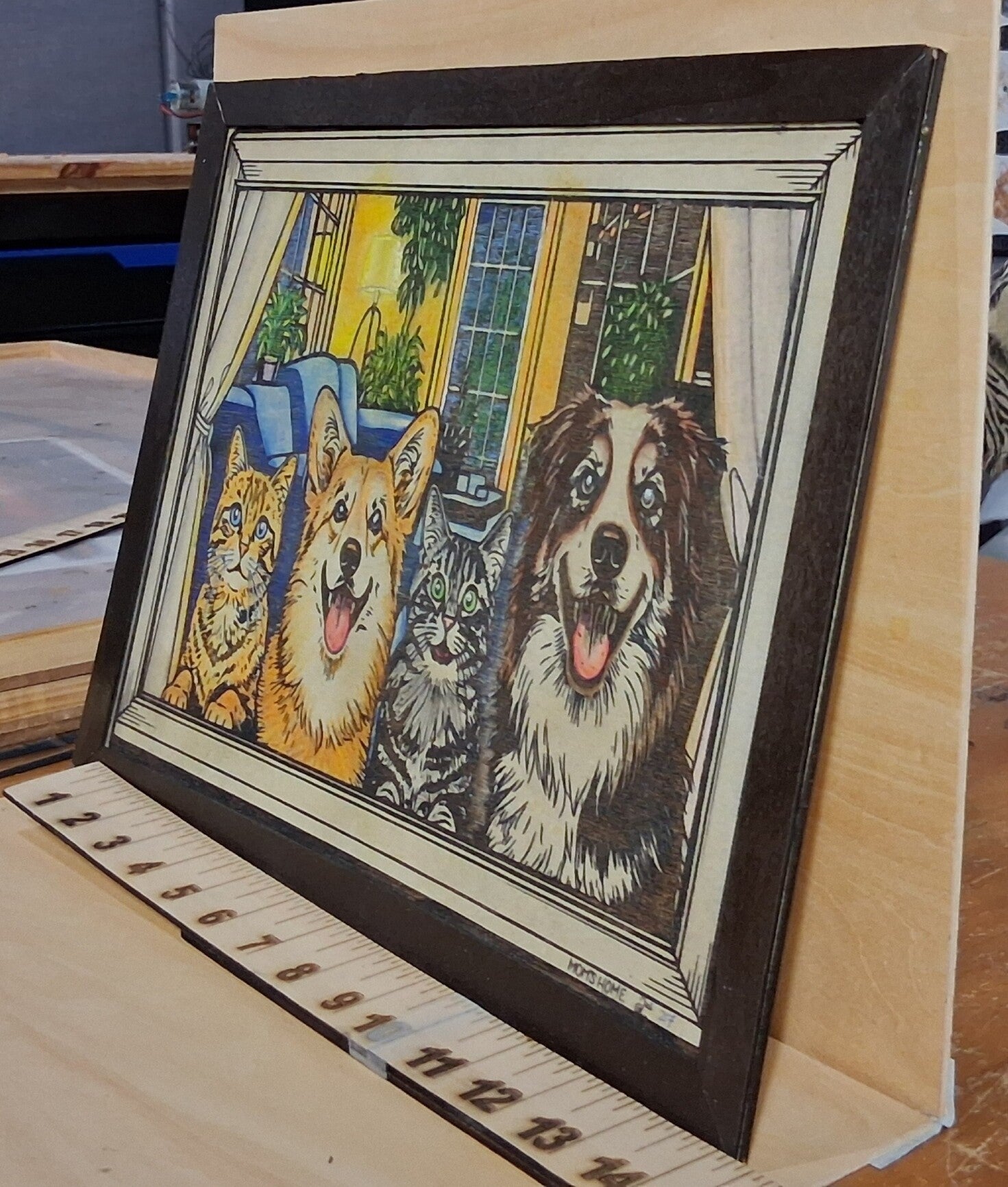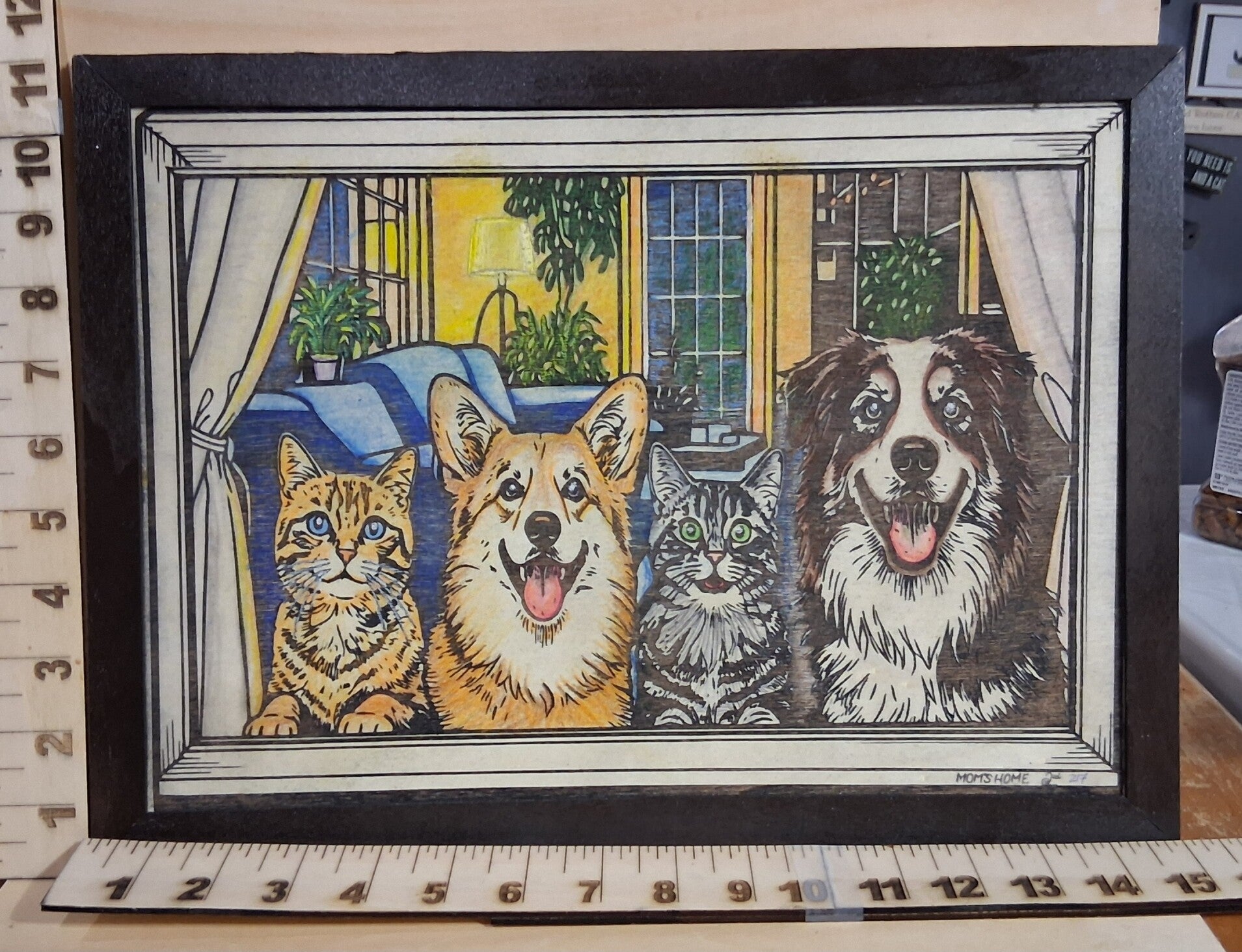 Mom's Home - 2 Dogs and Two Cats - eagerly waiting for Mom. Engraving on basswood.