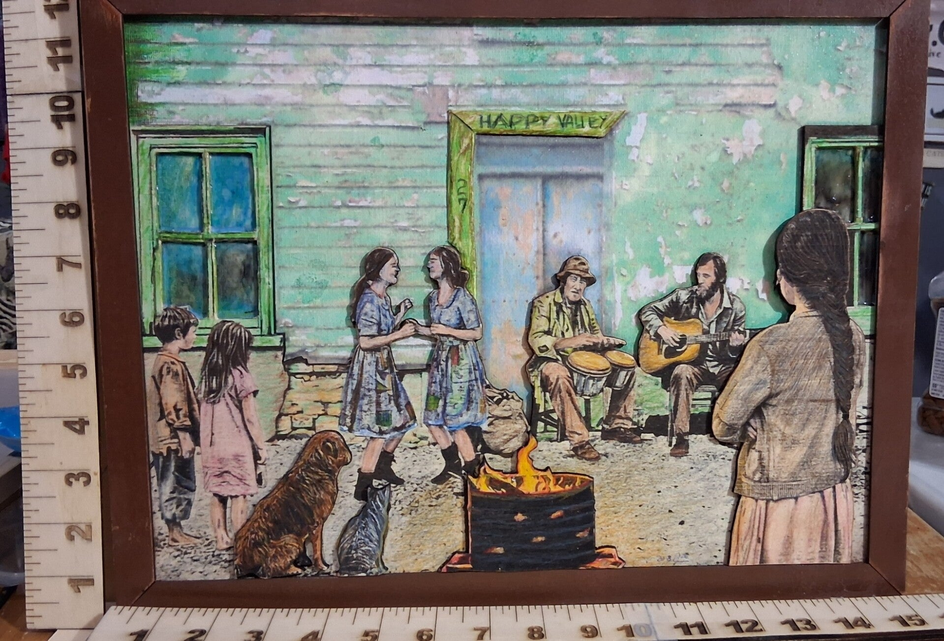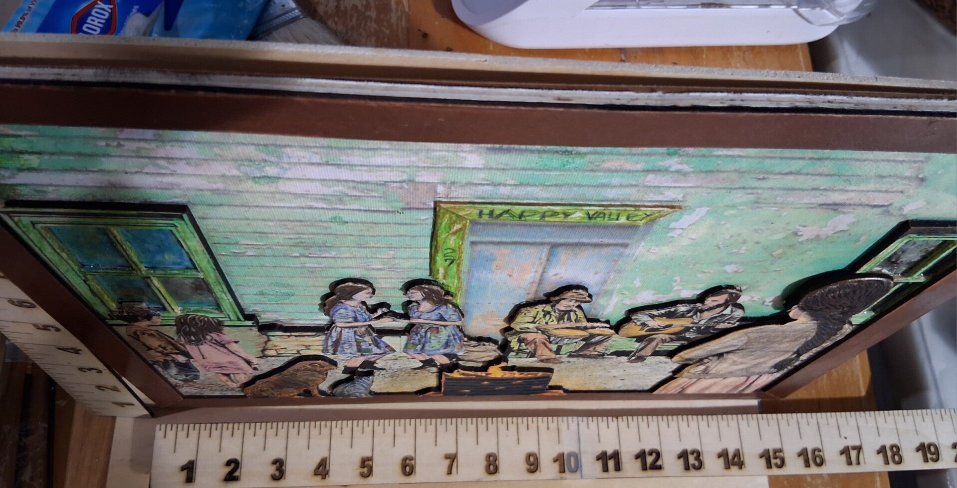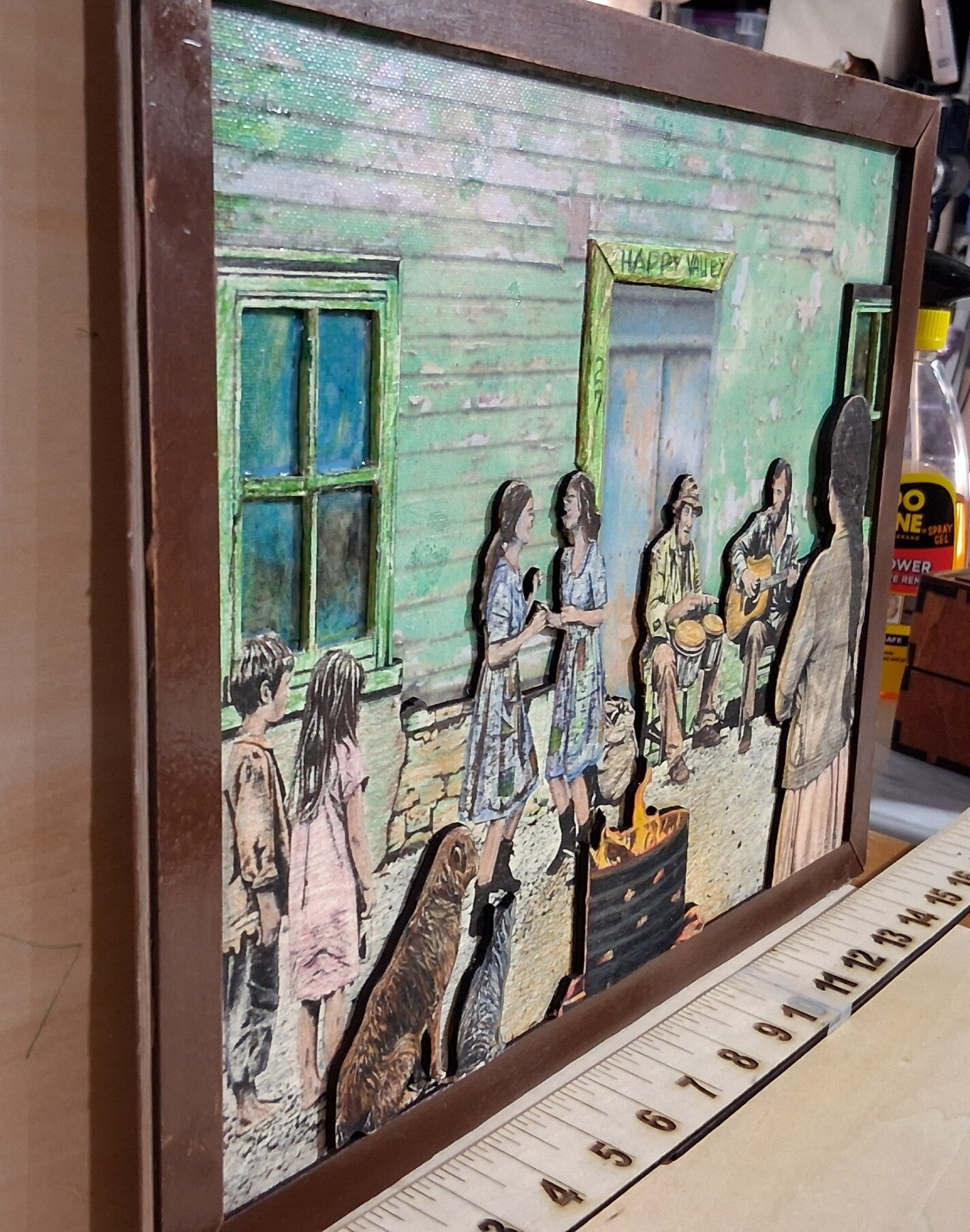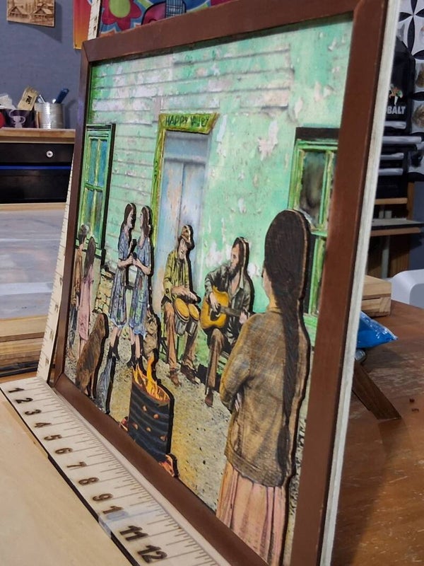 A 3D engraving - 3 layers of canvas and basswood to create depth.